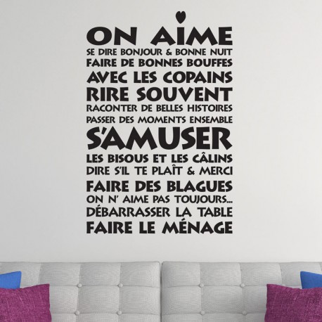 Grâce au Sticker "On aime", vous avez la possibilité de créer l’ambiance dont vous avez envie au sein de votre salon, chambre à coucher, cuisine ou même de votre salle de bains. Nos Sticker Muraux discount disponibles à l’achat conviennent aux envies déco des petits et grands : faites des économies tout en décorant avec nos stickers pas cher !